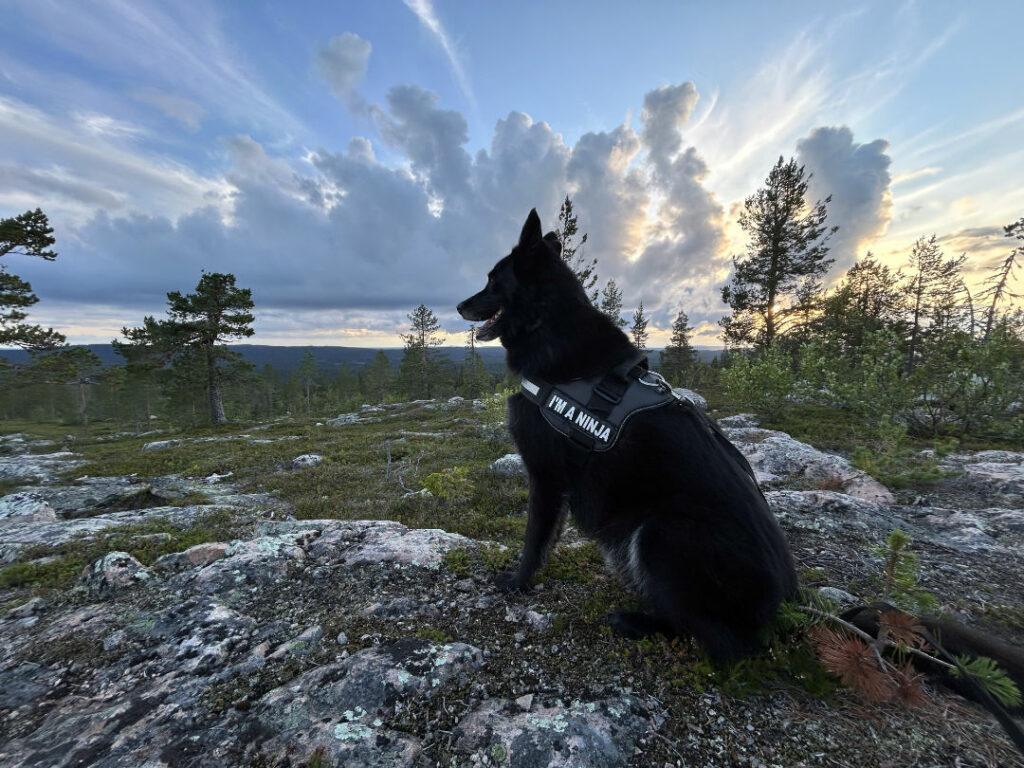 Denk je ons ergens tegen te komen? Dan kun je Ninja herkennen aan zijn blije “Oowhhooohoo”. Al maakt zijn harnas het waarschijnlijk nog makkelijker om hem te herkennen; het staat er letterlijk in blokletters opgeschreven: “I’M A NINJA”. Waar hij vroeger het waken over de camper nog als zijn taak beschouwde, is dat nu vooral slapen. Maar wat wil je op die leeftijd…